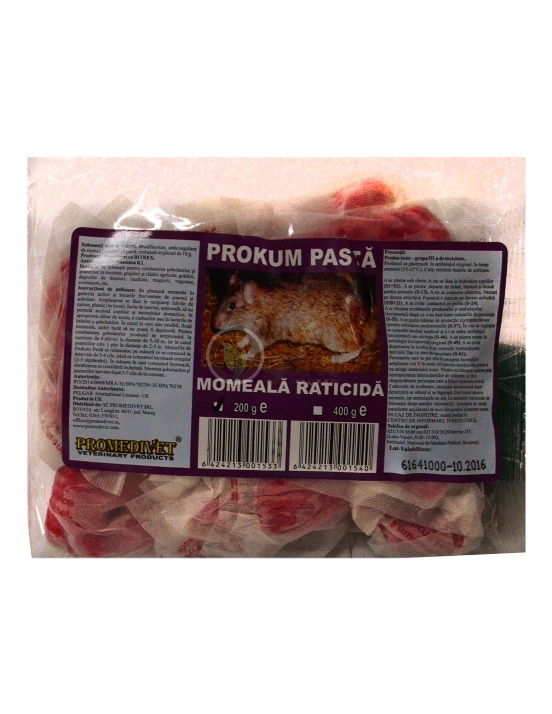 Prokum pasta, 150 g se folosește pentru combaterea șobolanilor și șoarecilor în locuințe, grajduri și clădiri agricole, grădini, depozite de deșeuri, cazărmi, magazii, vagoane, containere, etc.
