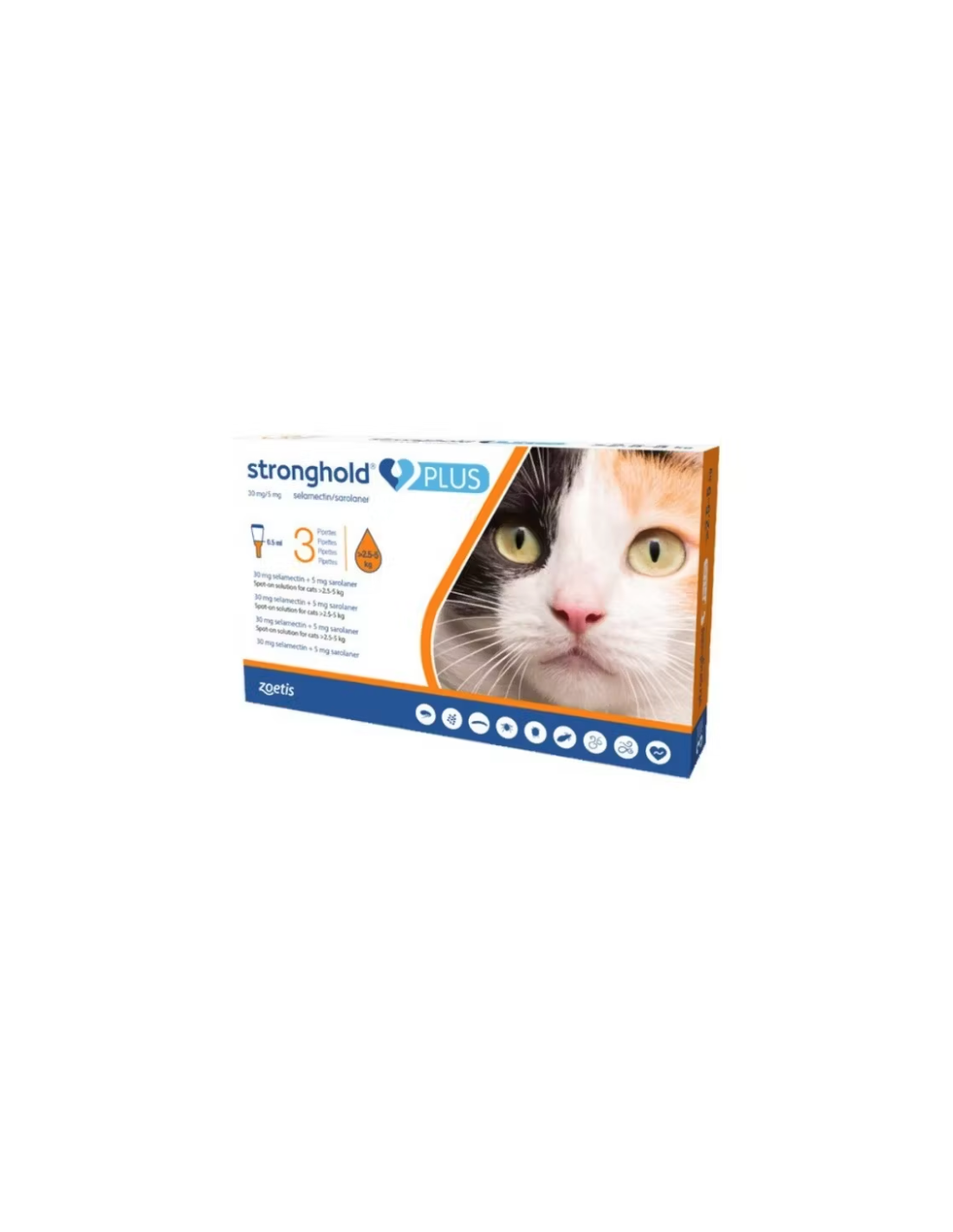 Stronghold Plus Pisica 30 mg, 0.5 ml (2.5 - 5 kg), 3 pipete este recomandat pentru pisicile cu infestări, sau cu risc de infestări parazitare mixte de căpușe si purici, păduchi, acarieni râiei, nematode gastro-intestinale sau dirofilarioză. Produsul medicinal veterinar este indicat în mod exclusiv pentru utilizare împotriva căpușelor și una sau mai multe dintre celelalte specii țintă de paraziți sunt indicate în același timp.